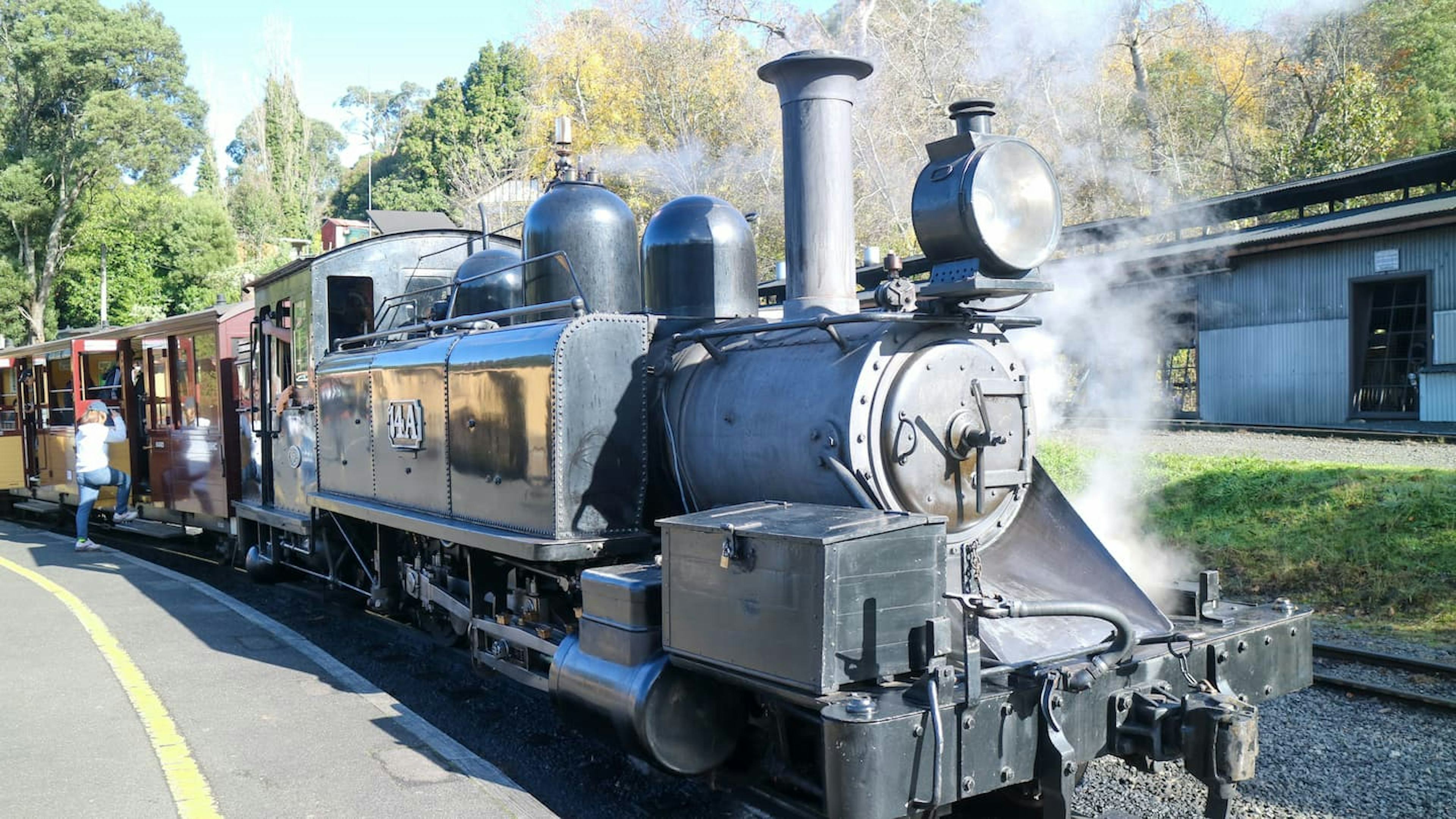 1900年に建設されたオーストラリア最古の蒸気機関車・パッフィンビリー号。現在は地元のボランティアによって運営されています。また、窓に腰掛けて足を出しながら乗車できるめずらしい観光列車です。