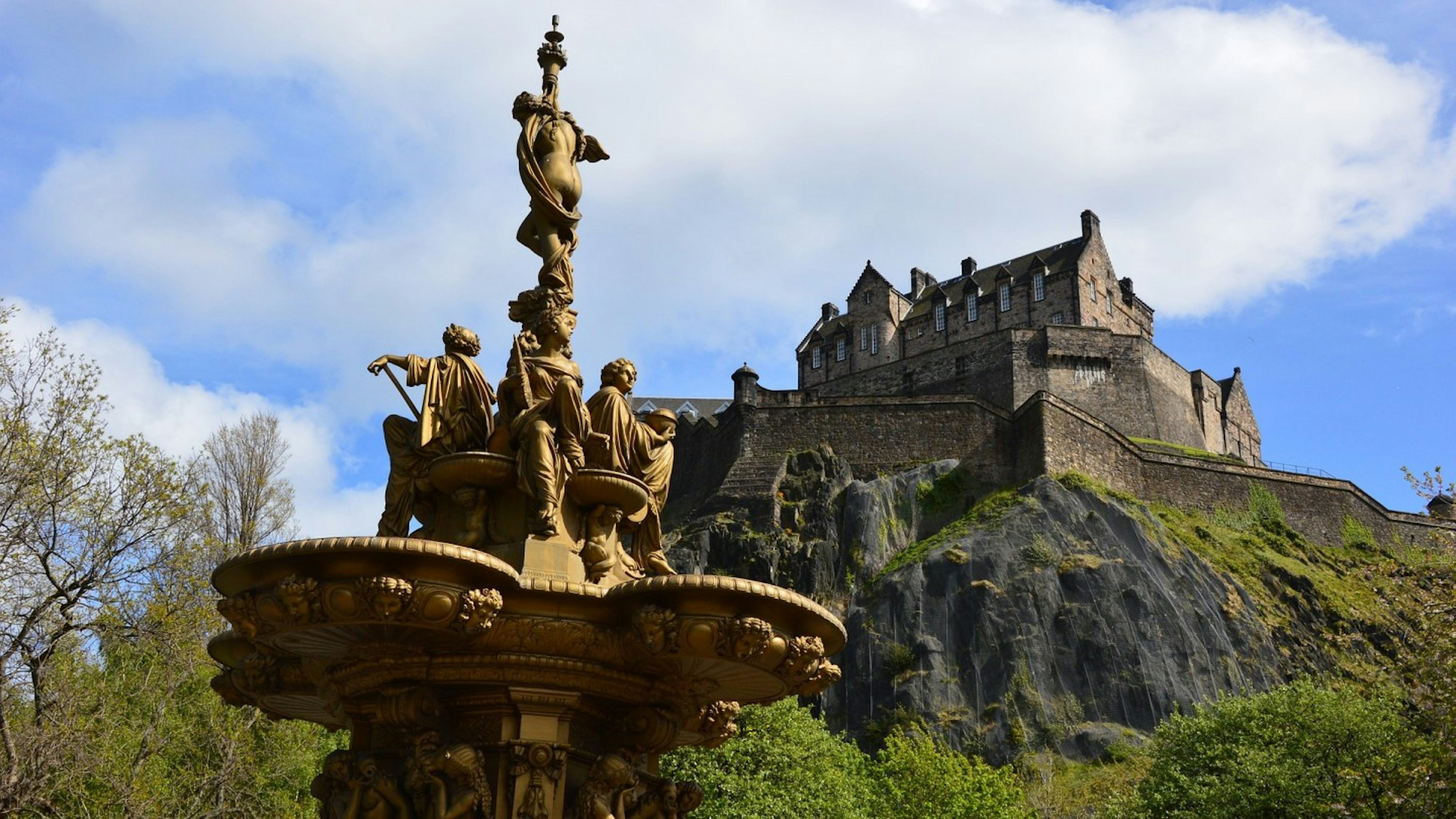 プリンシズ ストリート ガーデンズは、緑あふれる敷地内に彫刻や噴水などが飾られており、エディンバラ市民の憩いの場となっています。ちょうどエディンバラ宮殿のワン オクロック ガンが発射される場所に向いており、13時には大砲が発射する様子が見られますよ。