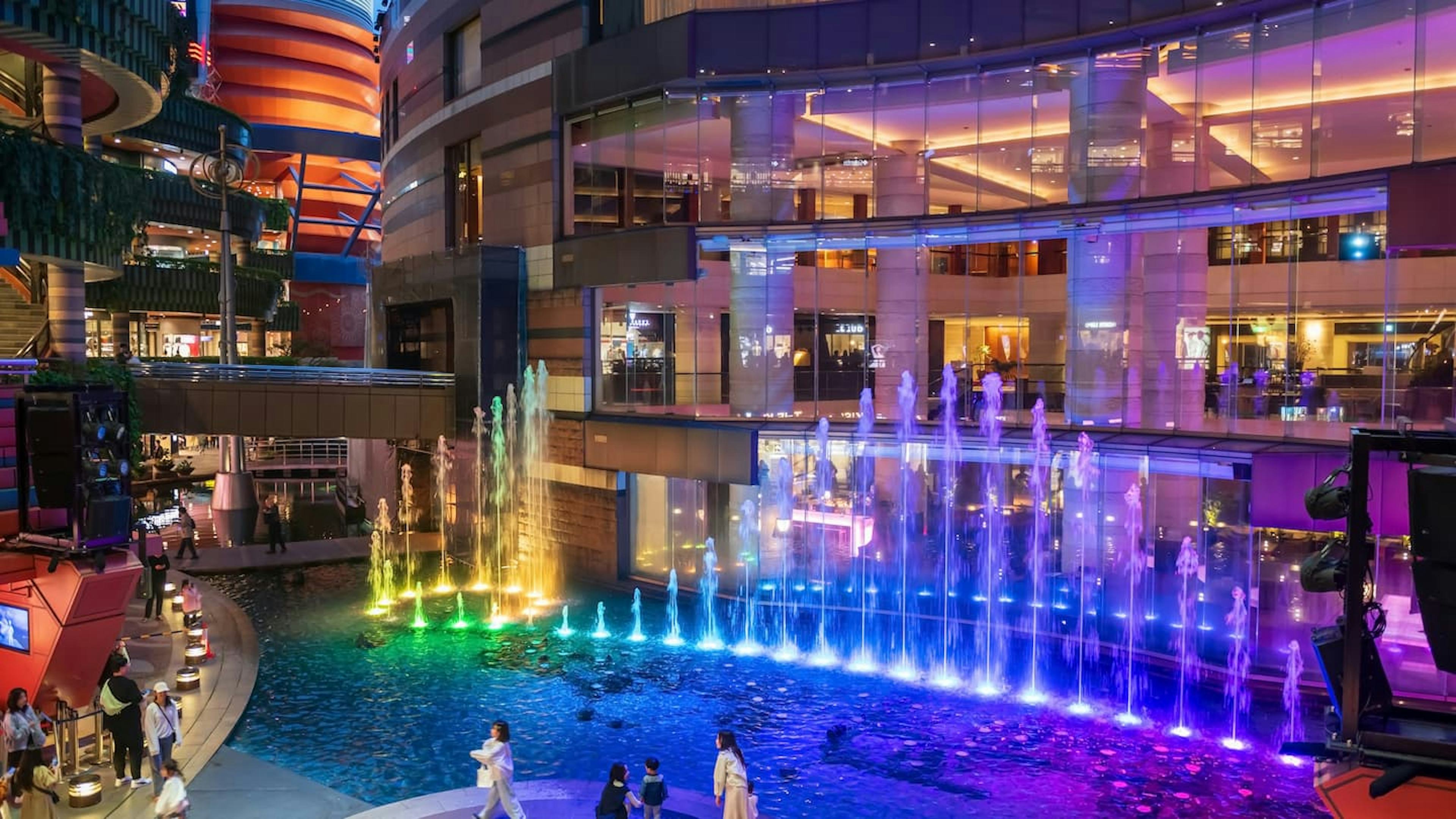 キャナルシティには、ショッピングやグルメが楽しめるショップや、ホテルなどの施設が集結していてちょっとした時間を過ごすのにぴったり。中央にあるサンプラザステージでは、噴水ショーが開催され、キャナルシティのシンボルのようになっています。