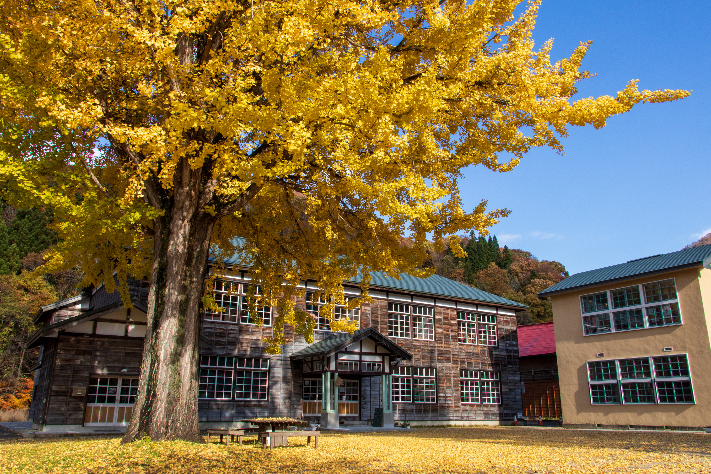 映画の舞台にもなったノスタルジック空間!昭和レトロな木造校舎と大イチョウ
