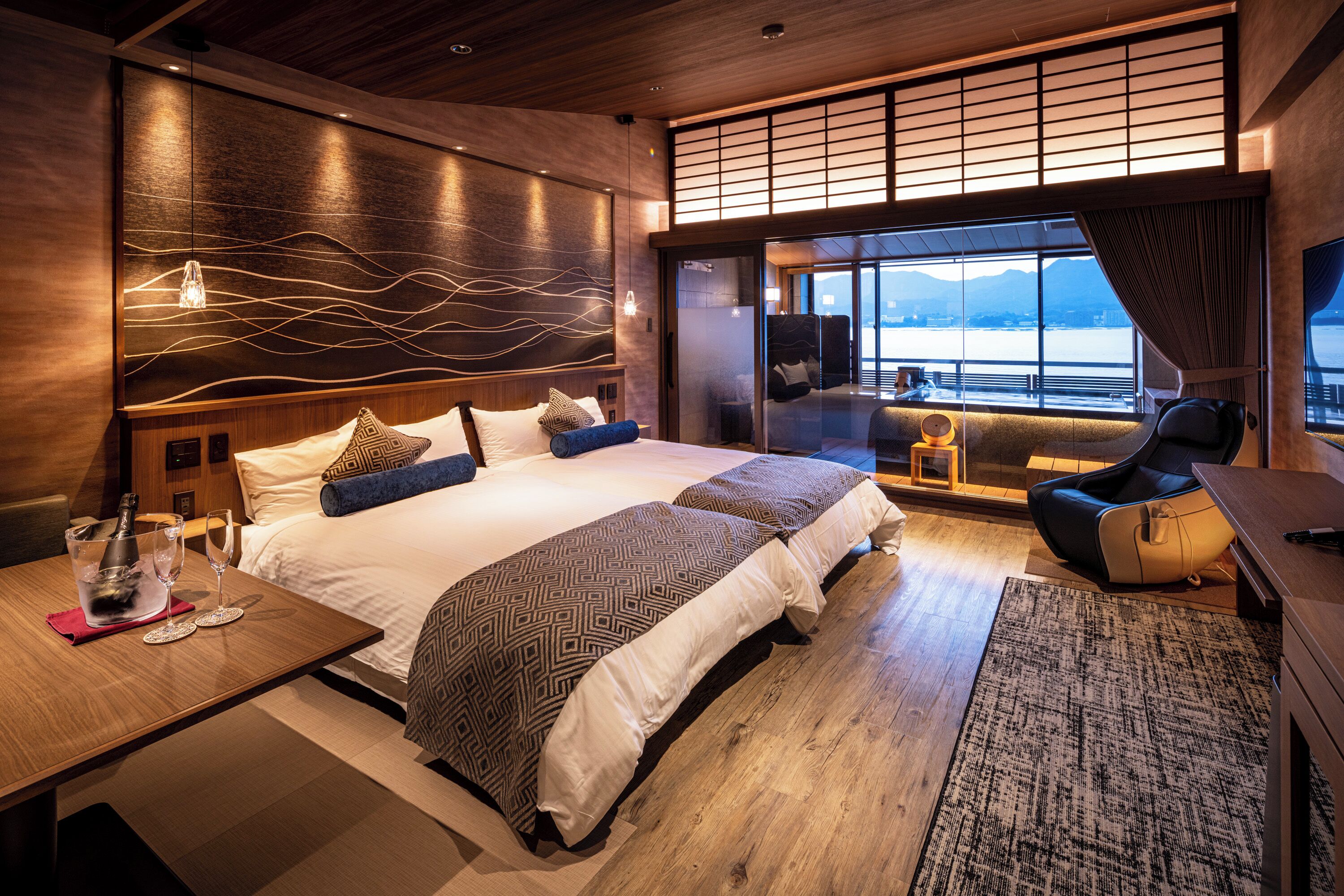約46平米の快適な空間で、半露天風呂や電動ベッド、マッサージチェアといった設備が整っており、宮島らしい眺望を好きなだけ満喫しながら上質な時間を過ごせます。小学生以下は宿泊不可の部屋なので、プライベート感を重視したいカップルや記念日旅行にもおすすめですよ。