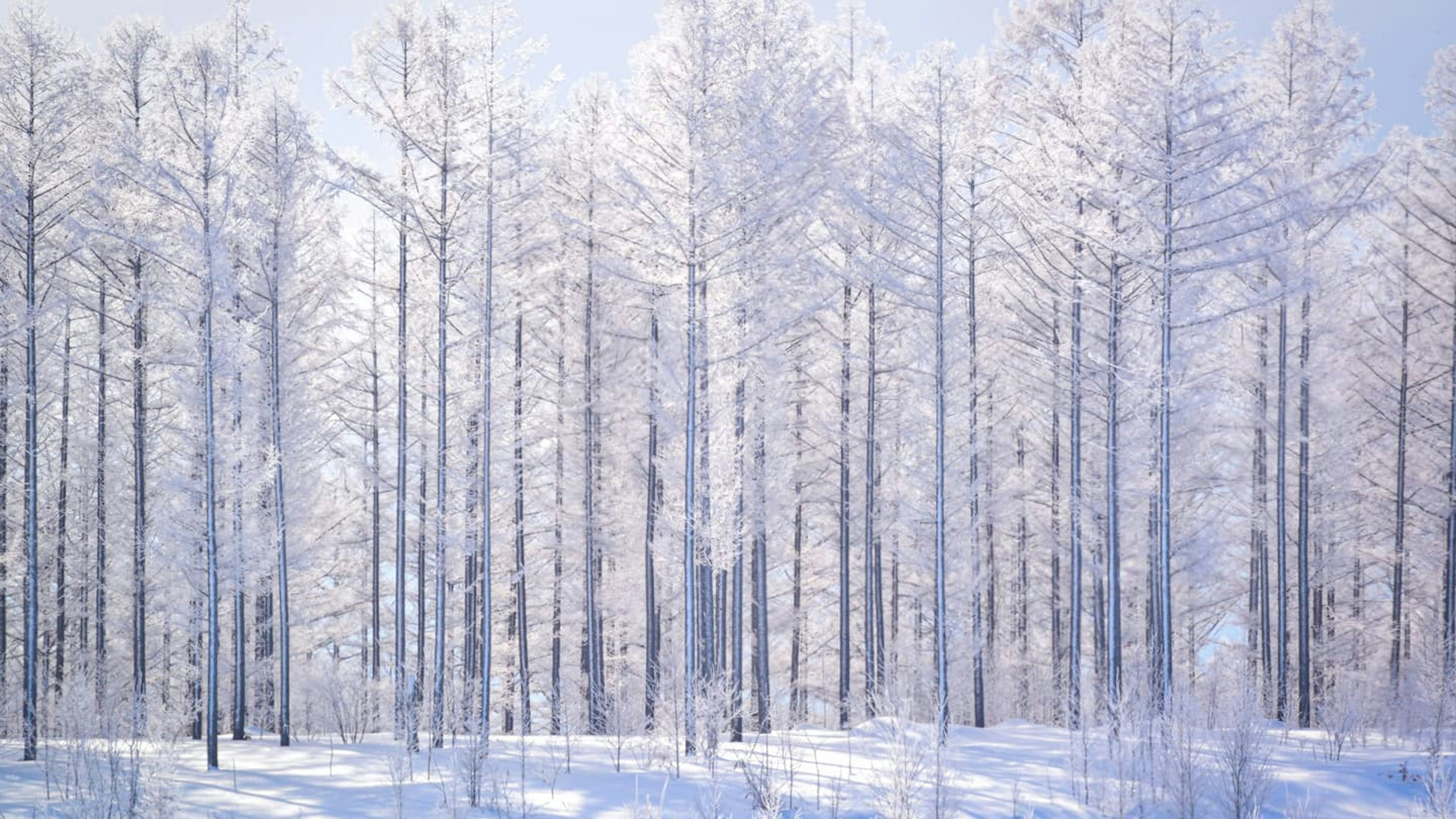 白金青い池は、その名の通り、神秘的な青さが魅力で有名な池。しかし冬は池が凍ってしまうため、その青さを見ることはできません。ところが、氷に覆われた水面には白い雪が降りつもるため、夏とはまったく違う別世界が広がるのです。真っ白い雪の上に枯れた木の細い影が伸びる姿は、荘厳で息をのむ美しさ!