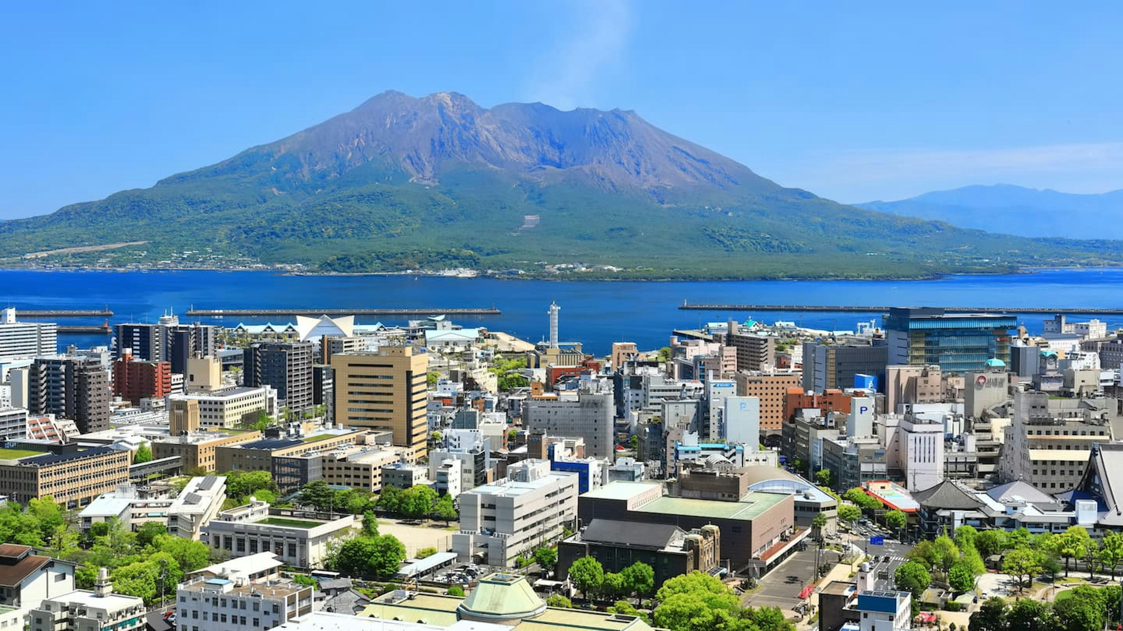 桜島は、鹿児島市のシンボルとして知られる活火山です。鹿児島湾(錦江湾)に浮かぶ姿は、四季を通じて圧倒的な存在感を放ちます。