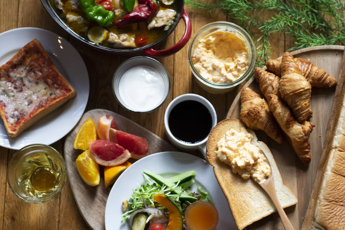 朝食ビュッフェのテーマは、新鮮な野菜をたっぷり使ったヘルシーでクリエイティブな料理です。特に人気なのが「つくるサラダ」コーナーで、種類豊富なフレッシュ野菜に加えて、ナッツ、スーパーフード(チアシードなど)、そしてビーツを使ったドレッシングなど、自分好みのサラダをカスタマイズできます。また、IKARIYA自慢の3種類のカリー(植物性食材の旨味を凝縮したものなど)や、京都の老舗ベーカリー「丸善」の食パンを使ったピザトースト、さらには京都産のミルクと「濃紅(のうこう)」たまごを使用したなめらかなプリンなど、一品一品に強いこだわりが感じられます。