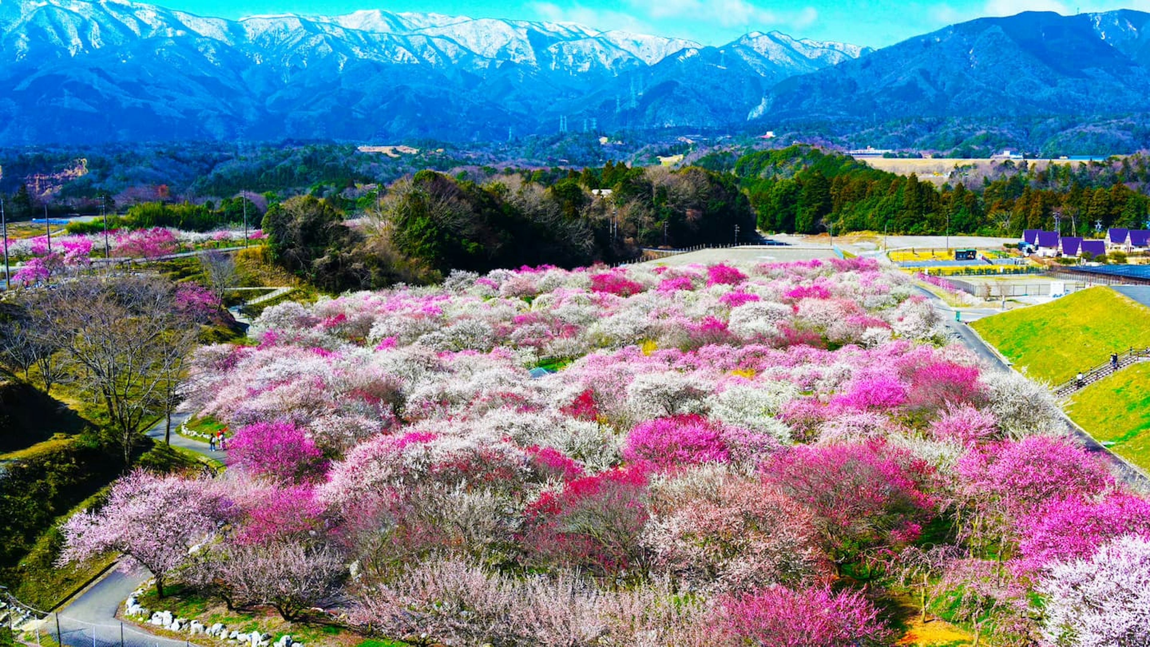 いなべ市農業公園は、東海地方最大級の規模を誇る花の名所として知られています。中でも春に見頃を迎える梅林公園は、約100種類・4,000本以上の梅の木が一斉に咲き誇り、甘く爽やかな香りとともにピンクや白のグラデーションが広がる圧巻の光景が楽しめます。