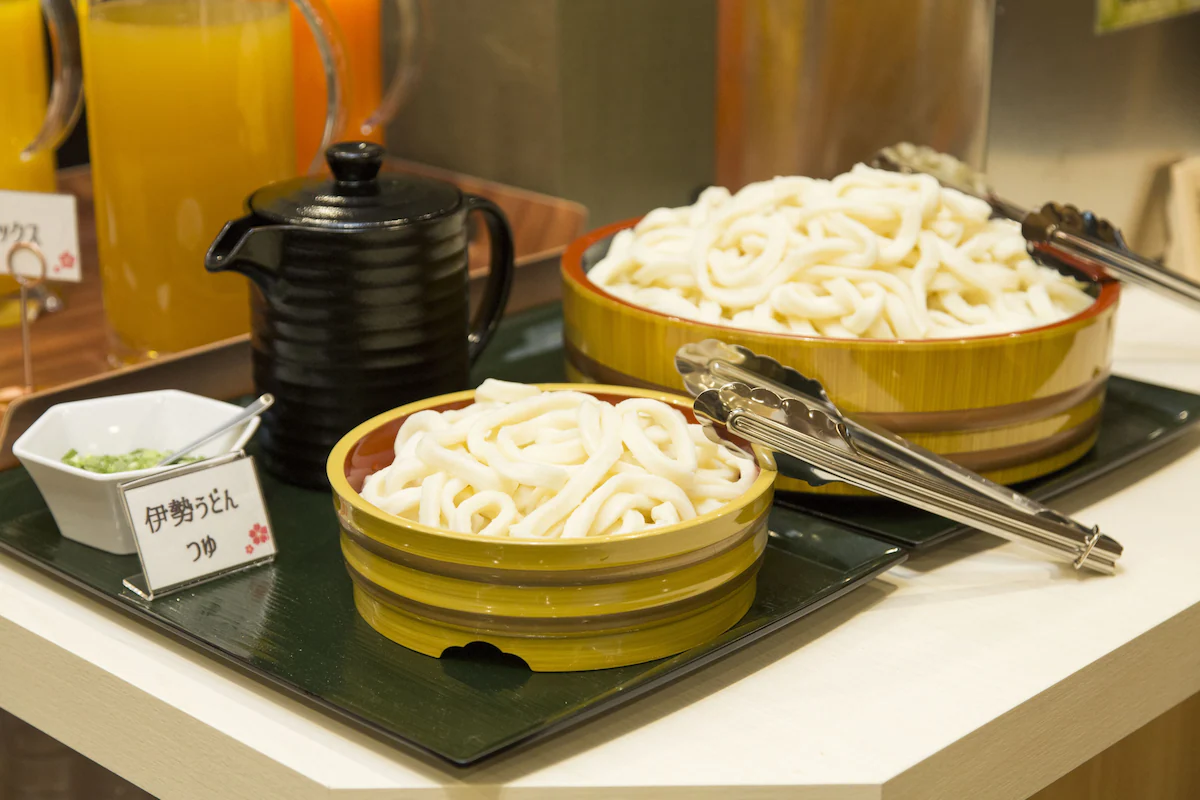 一日の活力となる朝食は、館内の朝食会場「S-cafe」で和洋ビュッフェスタイルで提供されます。定番のメニューに加え、絶対に食べておきたいのが「伊勢うどん」などのご当地メニュー。ふわふわと柔らかい極太麺に、真っ黒で濃厚なタレを絡めて食べる伊勢うどんは、消化も良く朝のお腹に優しい一品です。