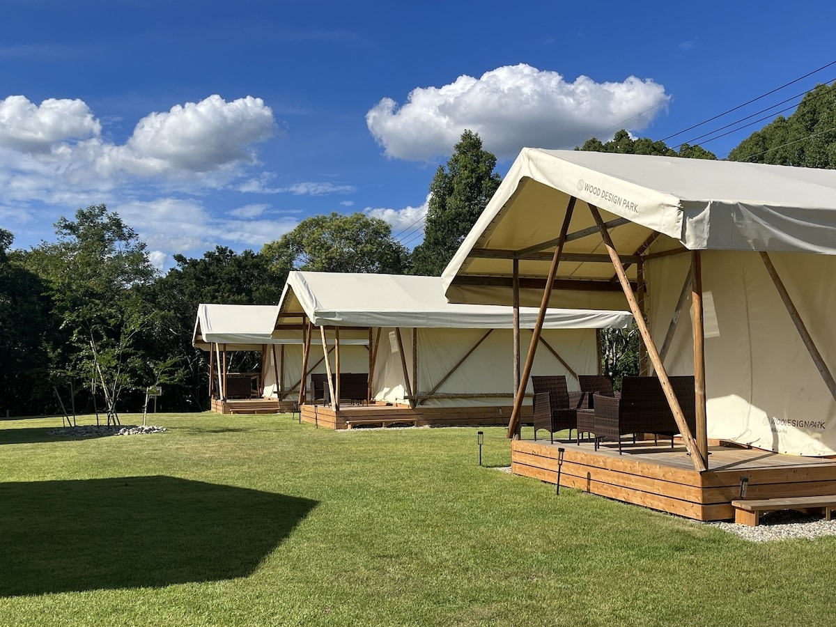ウッドデザインパーク瀬戸のグランピングテントは、全棟に冷暖房、温水洗浄便座つきのトイレ、バスルームが完備されているため、小さな子ども連れでも安心して過ごせます。テントは「なごみ」「やすらぎ」「いろどり」の3つのテーマがあり、とくに「いろどり」はきのこのクッションや木のオブジェが飾られた森のような空間で、子どもたちが喜ぶでしょう。