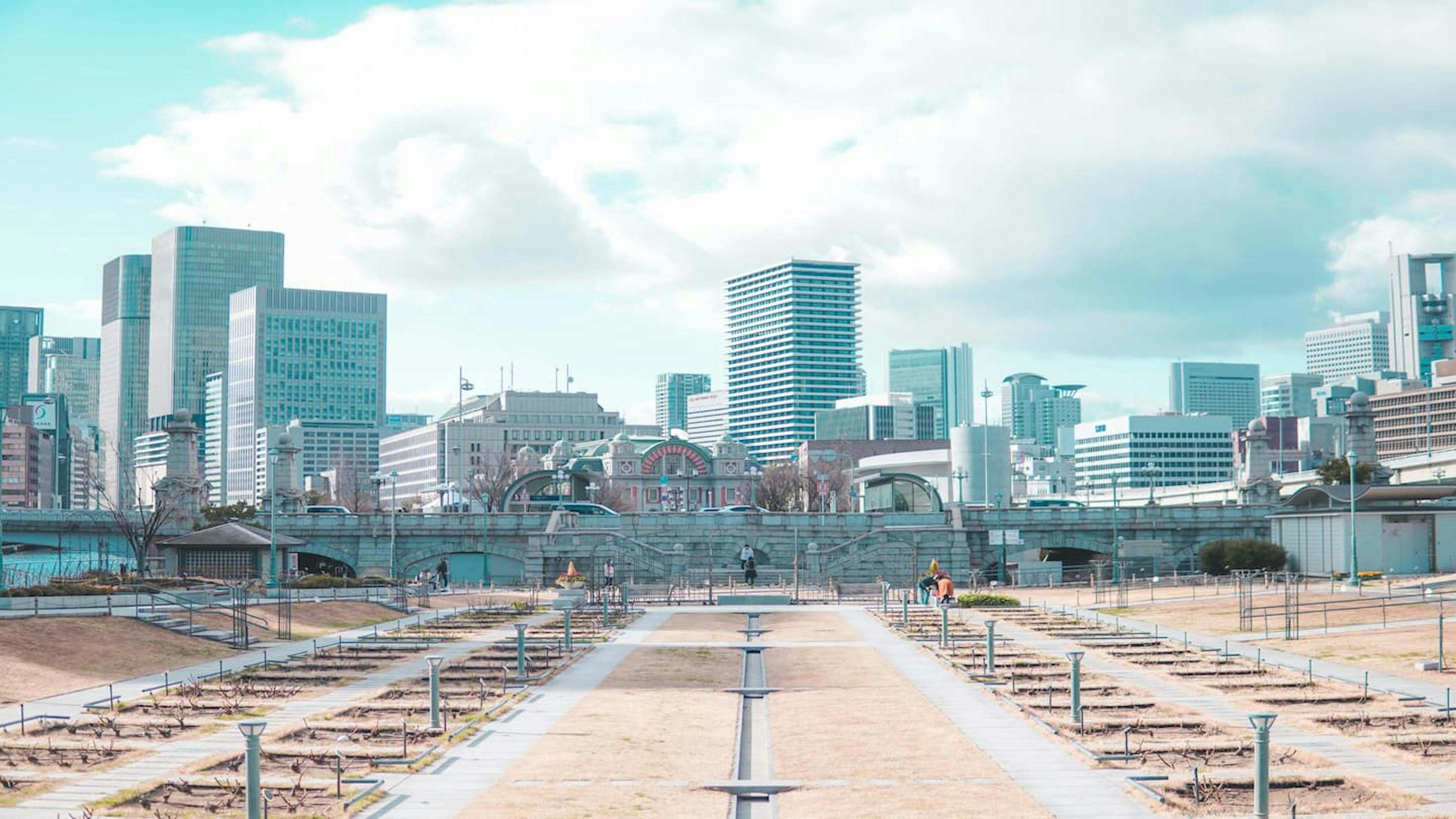 中之島公園は、中之島の東部に位置する周囲をオフィスに囲まれた公園です。明治24年(1891年)に大阪市内ではじめて誕生した公園で、オフィス街にありながらも堂島川と土佐堀川にはさまれ緑あふれる都心のオアシスとして愛されています。
