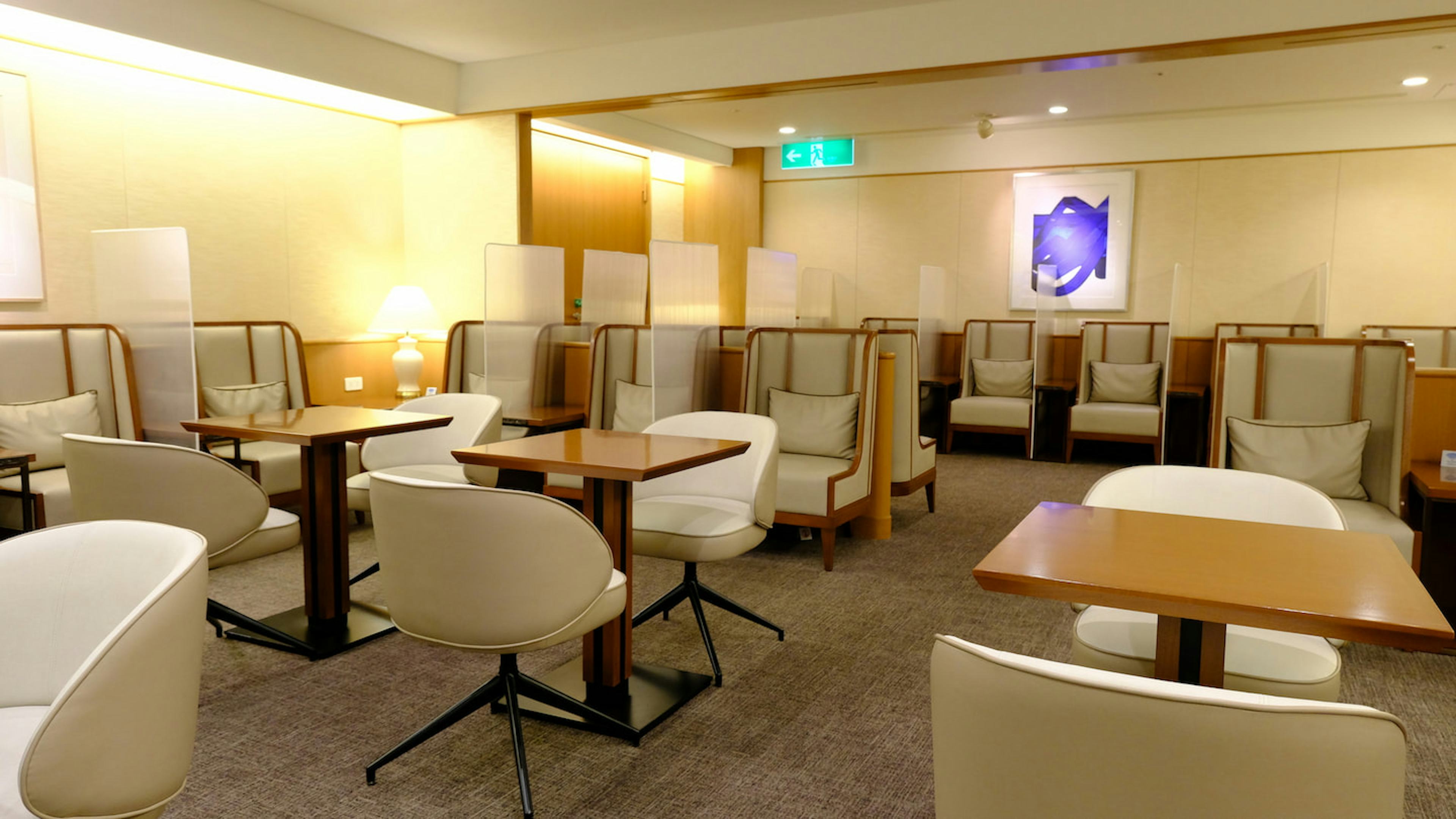 場所は、第1ターミナル国際線のゲートエリア中央、出国審査を終えてすぐのところ。シャトルに乗る前の免税店の集まりのあたりです。高級ブランド店のような豪華な室内で、多くの席は搭乗口や滑走路の眺めを満喫できる窓向きになっているのが特徴。個別の仕切りがあるビジネスデスクや優雅な個別シートも充実し、それらとは別にダイニングテーブルもあって、ゆっくりと食事が楽しめます。