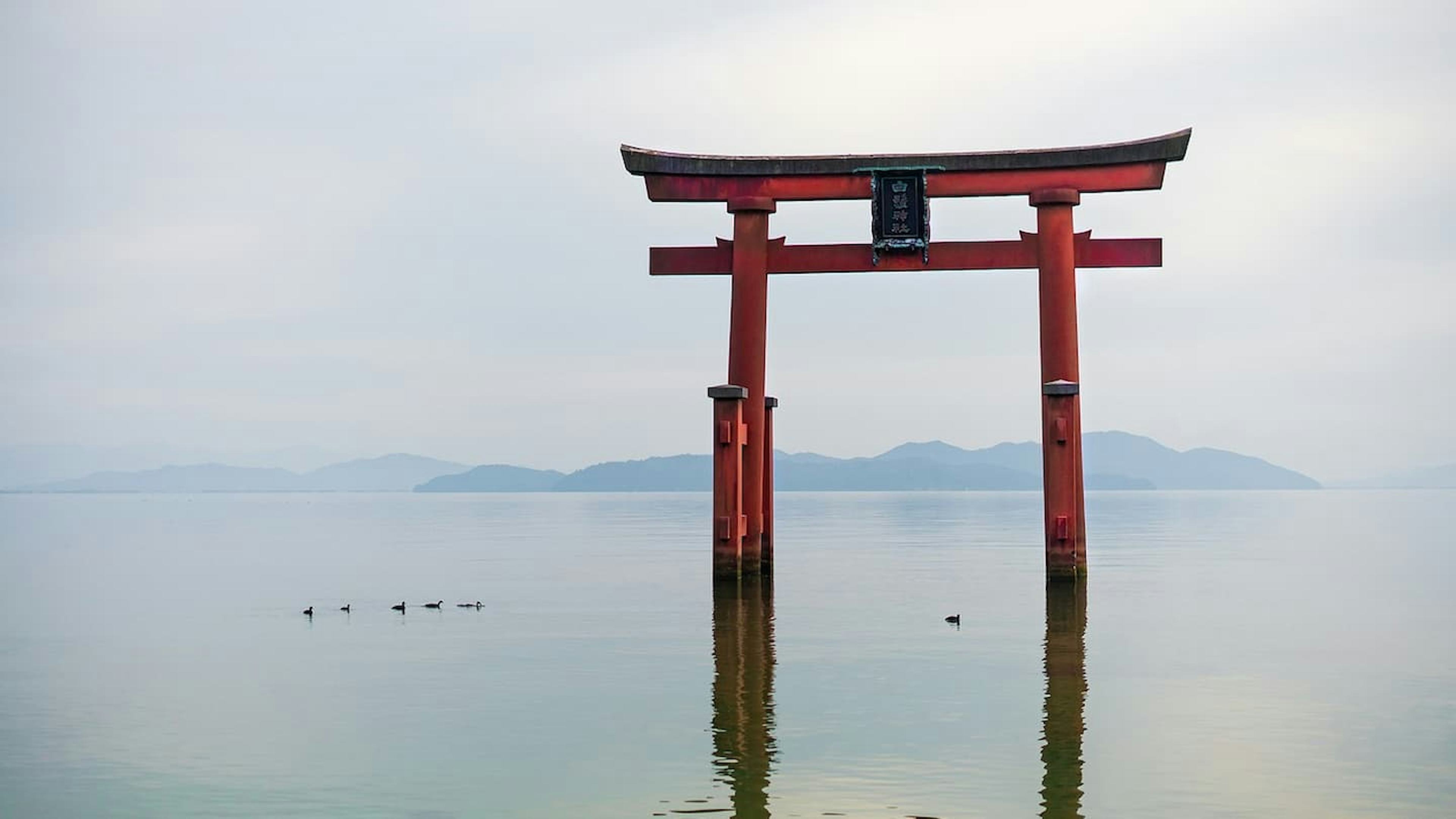 湖上に浮かぶ朱塗りの鳥居が神秘的!近江最古の大社