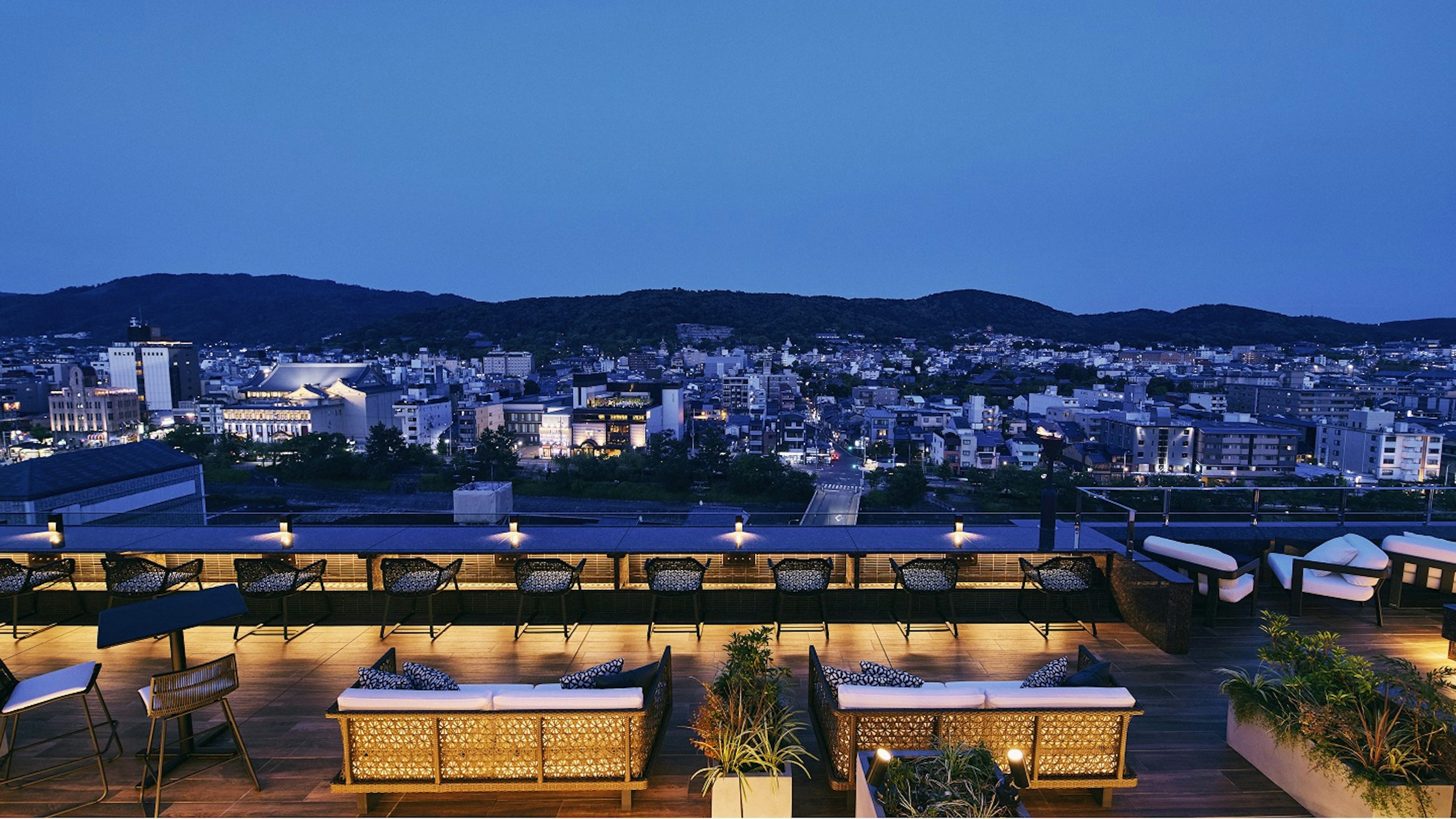 このホテルの象徴が、最上階にある「空庭テラス」。ここからは、眼下に鴨川、そして遠くに東山の山並みや清水寺などを一望でき、京都のうつくしいパノラマが広がります。併設された天空露天風呂「八坂の湯」につかれば、街の喧騒が嘘のような静寂と絶景に包まれます。