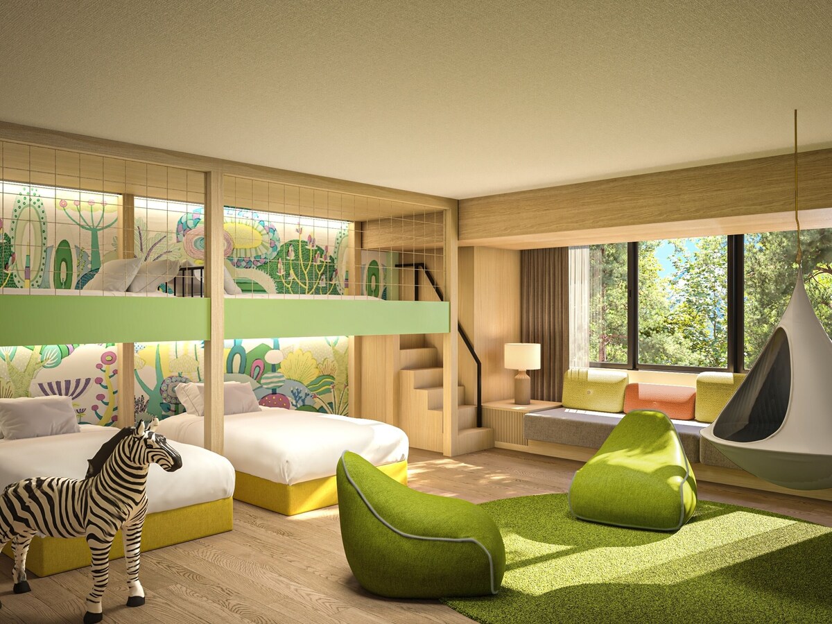 亀の井ホテル 富士でとくに子連れファミリーにおすすめなのが、新登場の「サファリキッズルーム」です。動物園をイメージした客室で、室内にはハンモックなどの遊具が設置されています。子どもたちがワクワクすること間違いなしのお部屋ですよ。