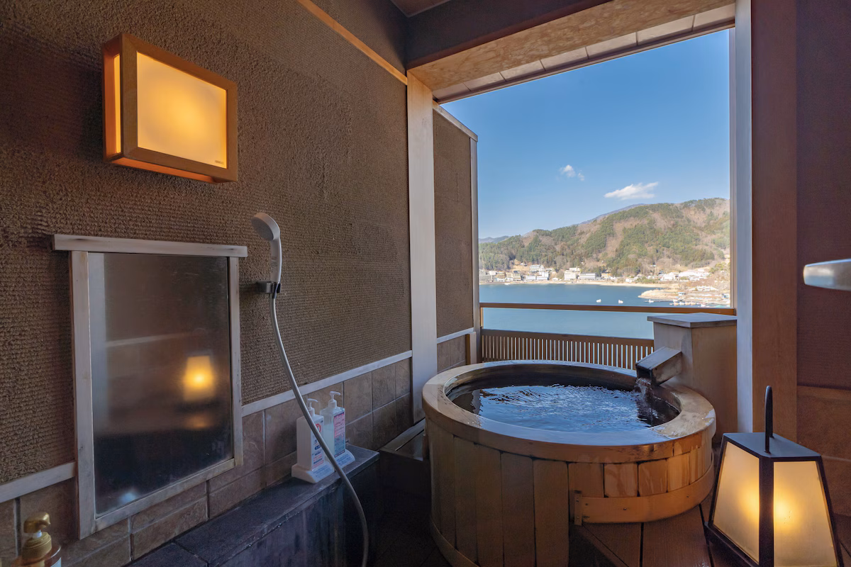 富士急行線の河口湖駅からはタクシーまたは送迎バスで約10分で到着できます。全120室の客室はすべて富士山ビューで、河口湖温泉引き湯の大浴場と露天風呂で温泉も楽しめます。