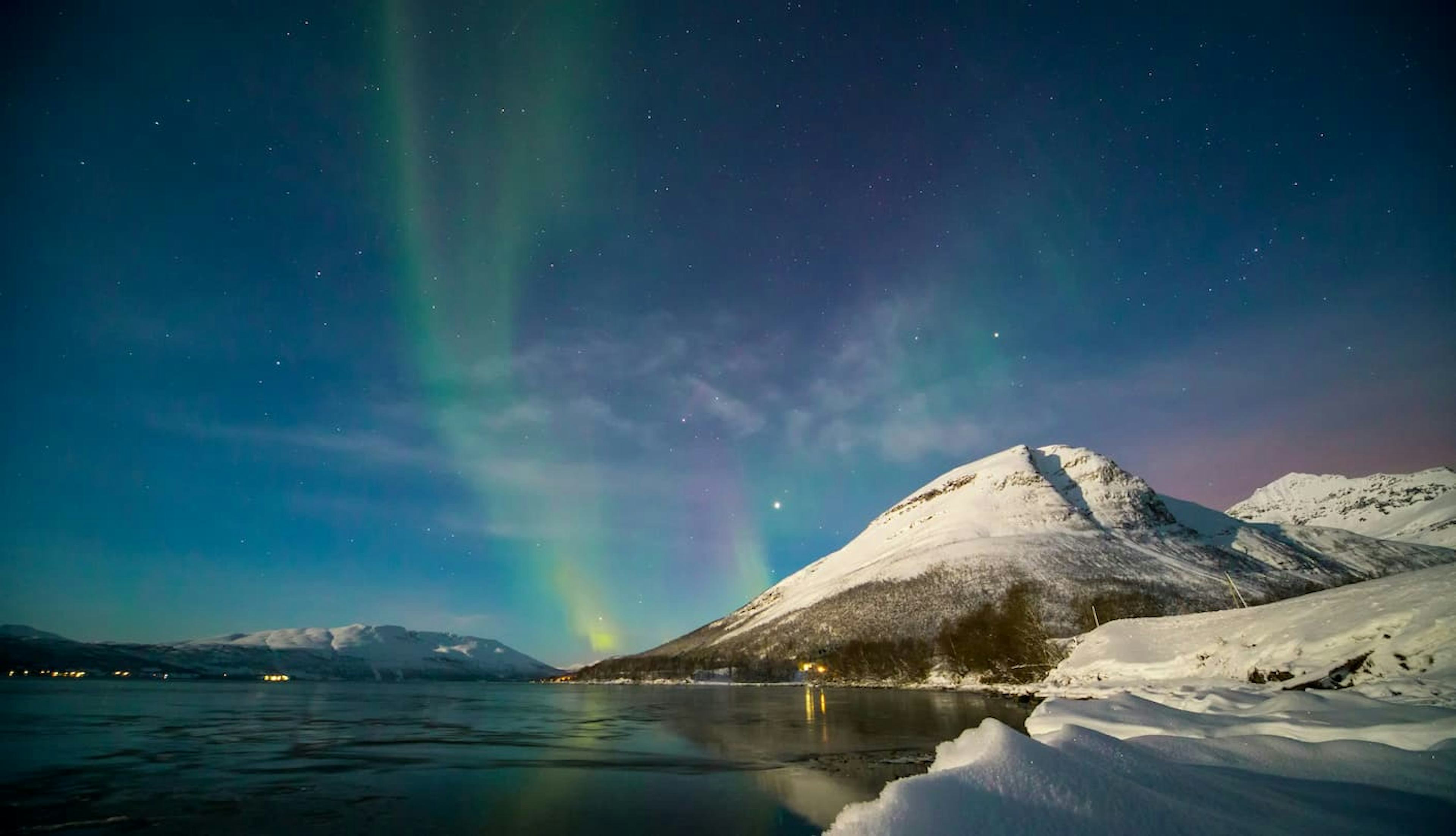 トロムソの観光といえば、まずはオーロラです。冬季(9月〜3月)の晴れた夜には、街の灯りから離れた場所で神秘的なオーロラを見られます。ガイド付きのオーロラハンティングツアーに参加するのがおすすめです。