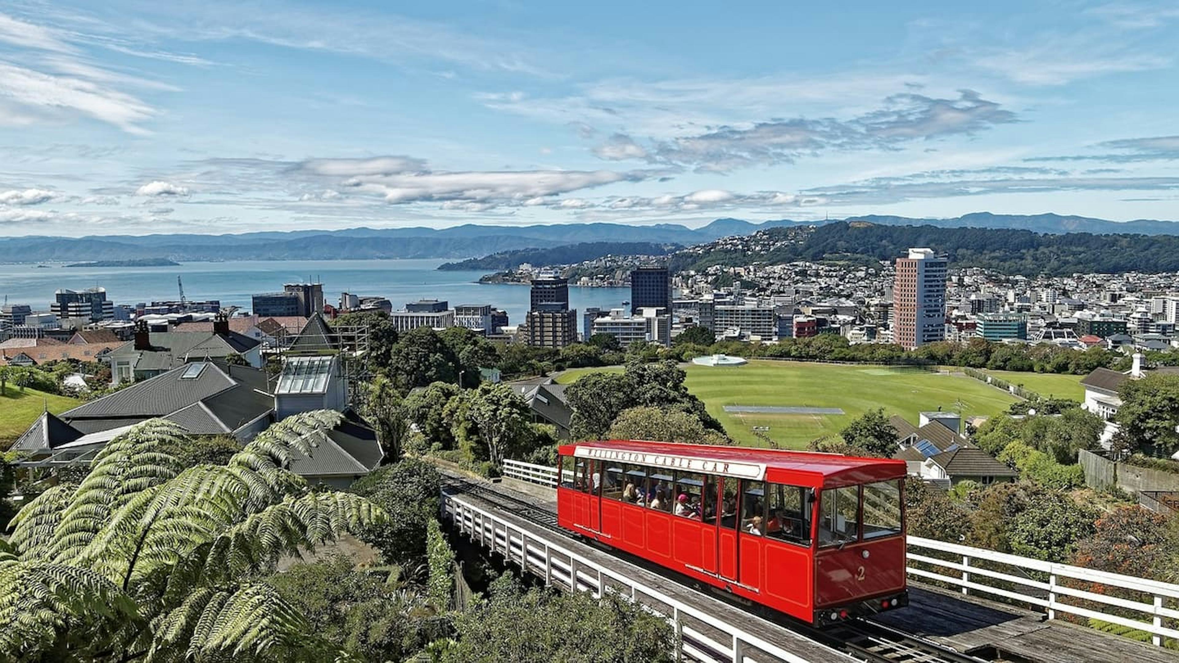 赤い車体が特徴的なウェリントン・ケーブルカーは、1902年に開業した歴史ある乗り物で、ウェリントンの街のシンボル的存在です。ラムトン・キー駅からケルバーン展望台まで、約5分間で約120メートルの高低差を登ります。急勾配の線路を上っていく間、ウェリントンの街並みを一望できる絶景ポイントがいくつもあります。