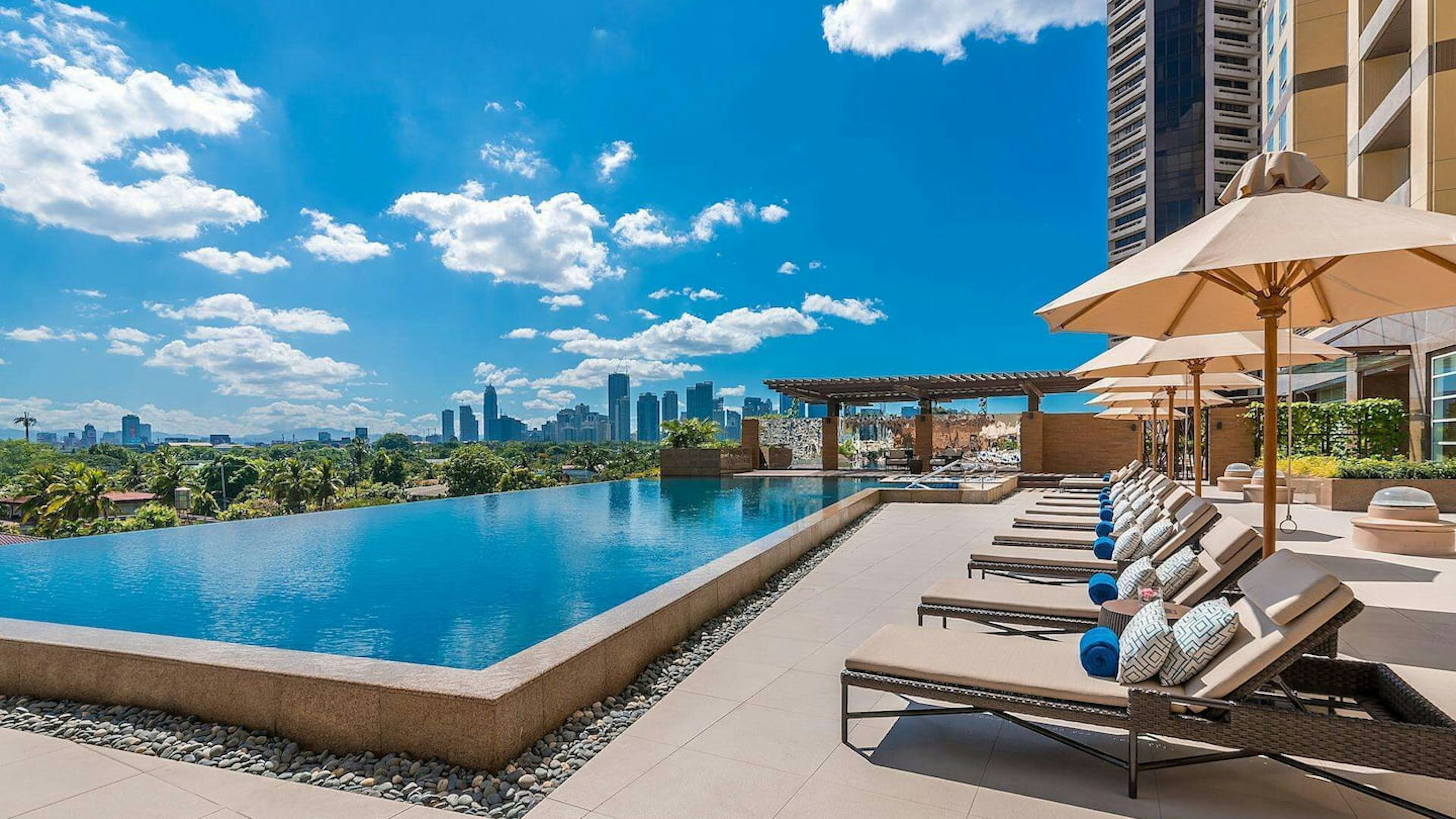 ホテルのなかでもぜひ訪れたいのは3階の屋外温水プール。20mの温水インフィニティプールで、とくに夕暮れからのマジックアワーの時間帯にはマカティの幻想的な美しさを堪能できます。