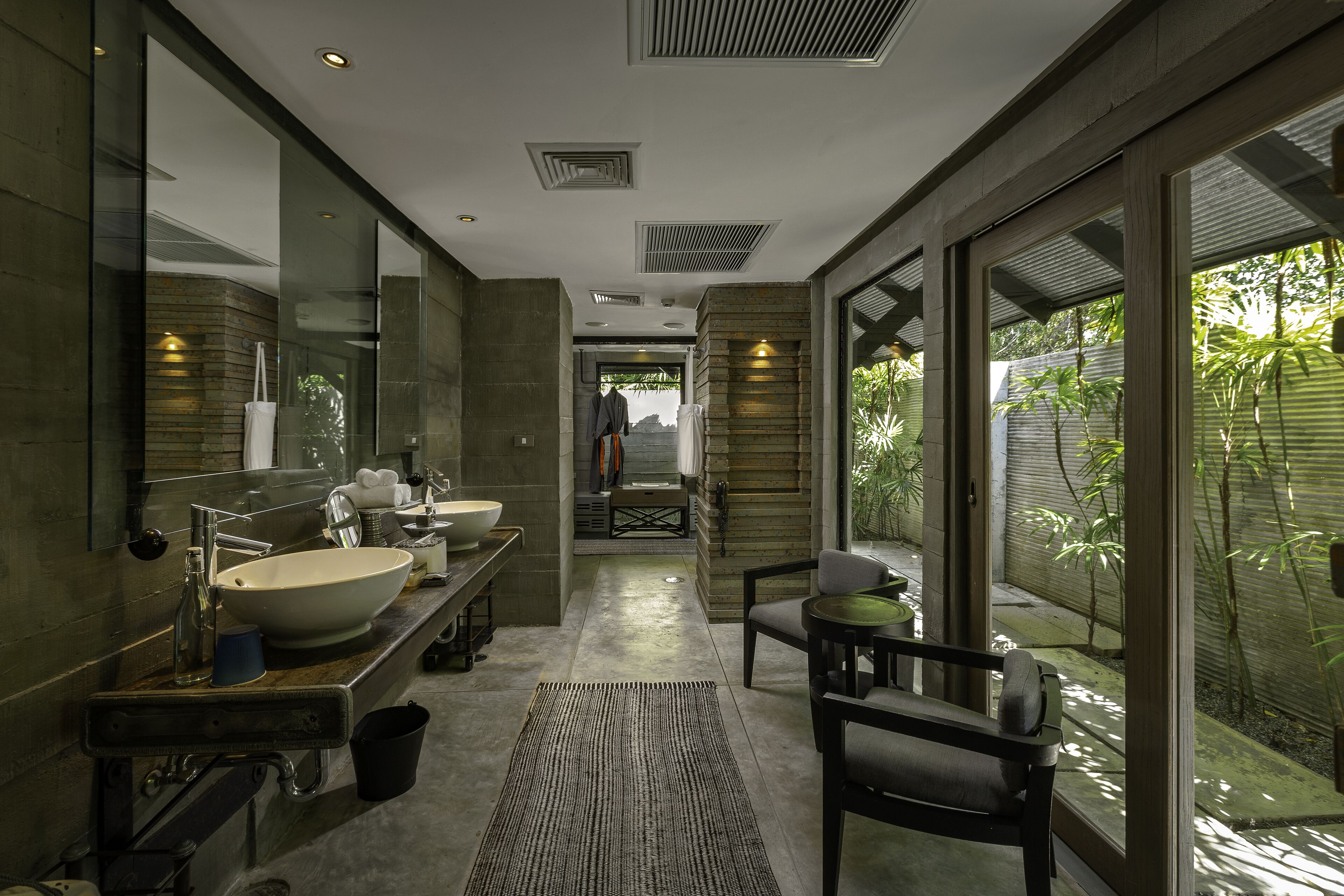 お部屋の中には、バスルームが屋外にあるタイプも。特大のテラゾ製バスタブ、シャワー、化粧台をそなえ、優雅なバスタイムを過ごせます。自然の香りや風に包まれながらの入浴は、開放感もばつぐん!屋内で浸かるよりも、身体の疲れをしっかり癒やせそうですね。