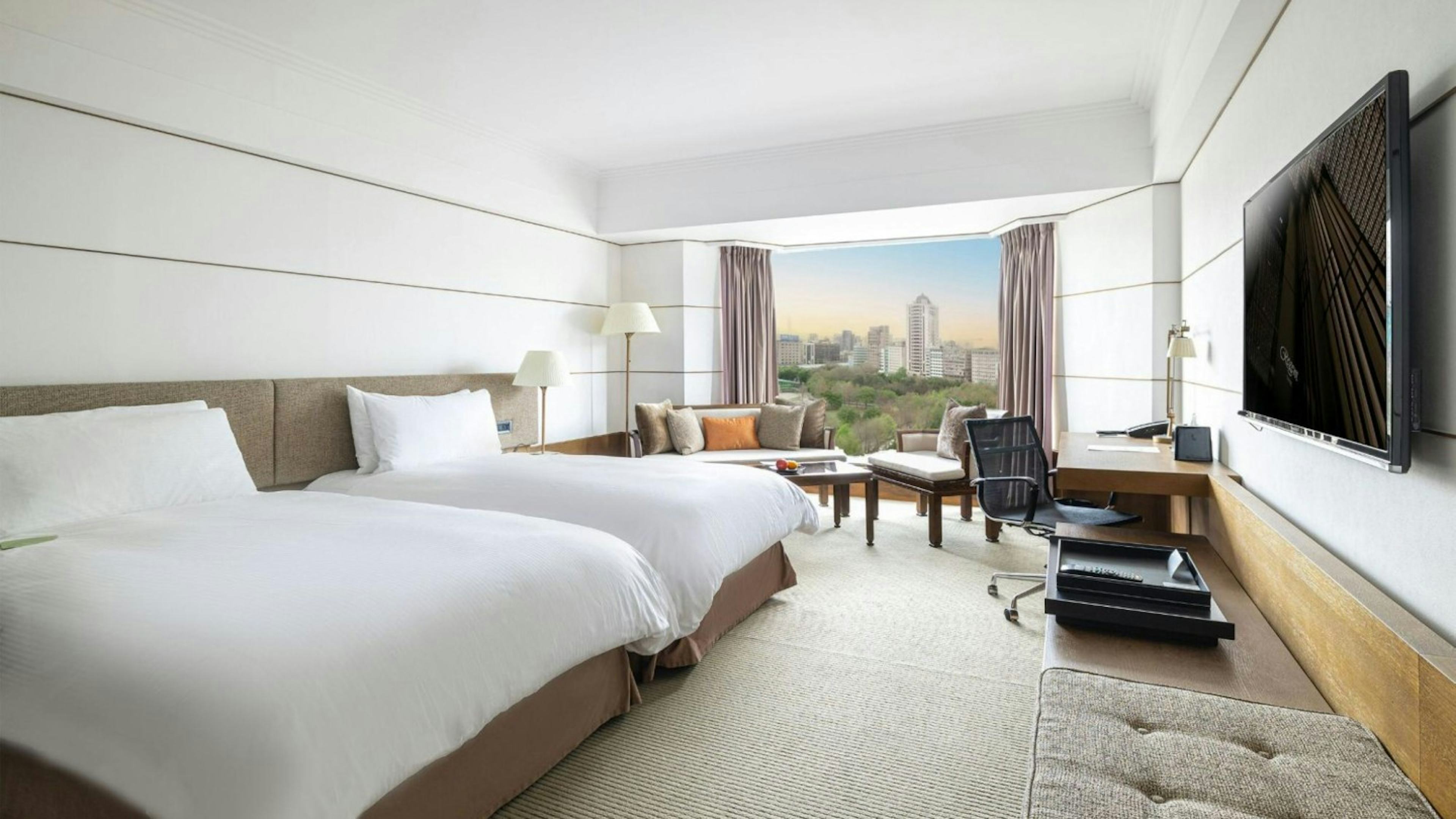 ベッドタイプは、キングベッドまたはシングルベッド2台から選択できます。ラグジュアリーなリネン素材でできた寝具は、寝心地もばつぐん!部屋の奥にある窓からは、台北の都会的な景色を一望できますよ。